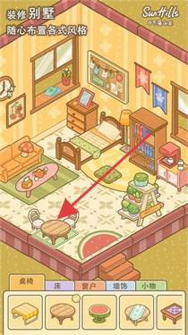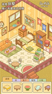 1、进入游戏后,可在房屋内部场景,点击下方菜单中的【家具】等选项,随心布置别墅内的各式风格,通过选择不同家具来装饰房间。