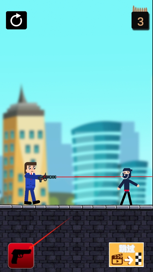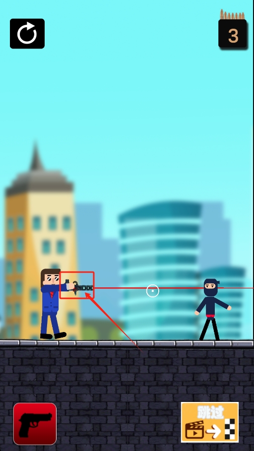 3、注意右上角子弹数量,合理规划射击,完成关卡任务,可点击跳过按钮推进。