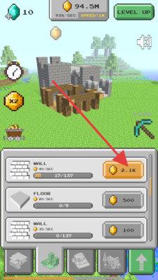 1、进入游戏后屏幕上方显示金币数量如94.5M等资源信息,点击界面上类似“WALL”等建筑选项花费对应金币如2.4K开始建造建筑部件。
