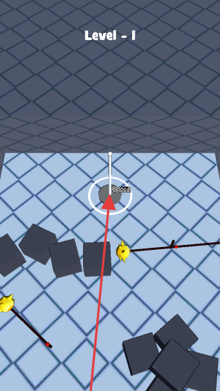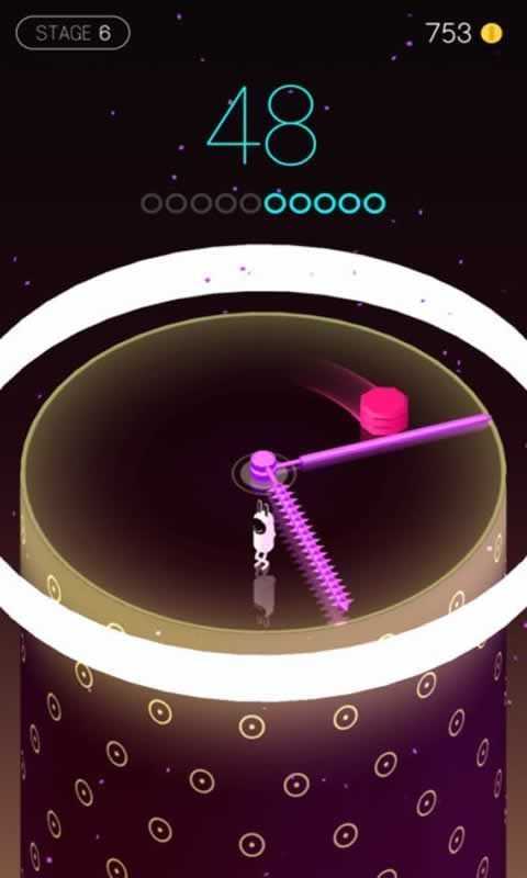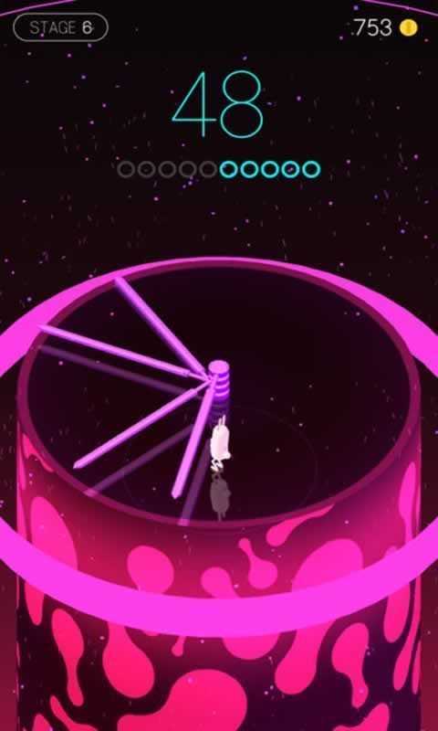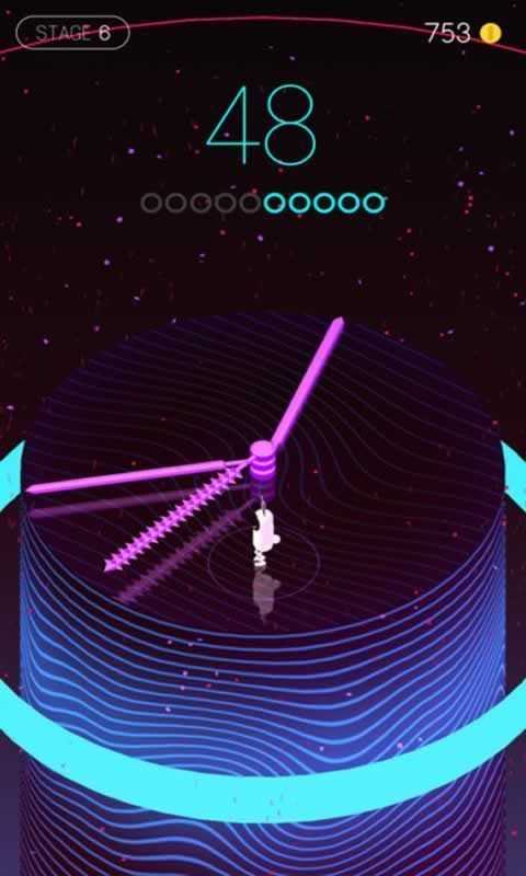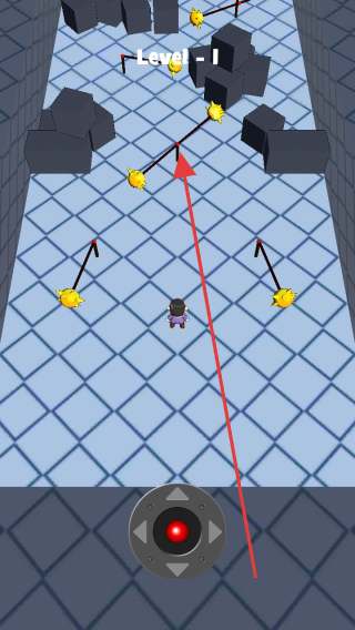 2、进入关卡后,依据箭头方向,使用下方虚拟摇杆操控角色前进,躲避旋转的黄色尖刺和黑色障碍物。