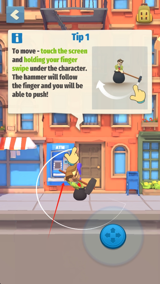 2、游戏中触摸屏幕并按住手指在角色下方滑动,使锤子跟随手指移动来推动角色前进。