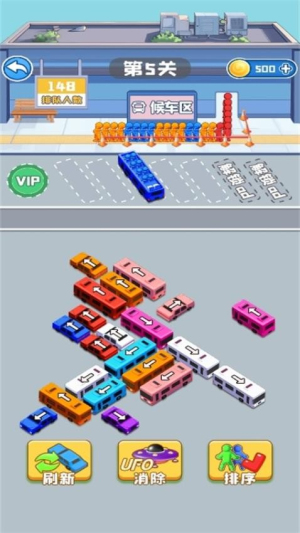 3、特殊道具系统支持,UFO道具可将障碍车辆移至停车场边缘,时间暂停器冻结拥挤区域3秒,传送带可转移特定方向车辆,策略组合使用可破解复杂路况。