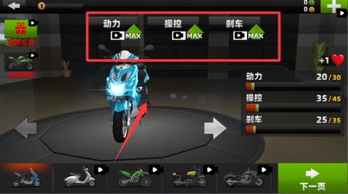 3、后期升级摩托车很重要,优先提升操控和加速性能。不同的赛道适合不同的车型,比如山地图选越野摩托,城市图选速度型摩托。