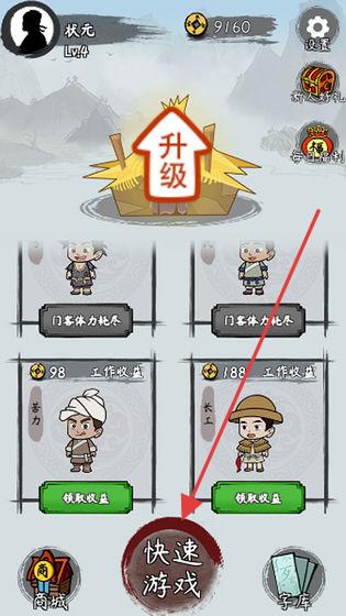 1、玩家扮演Lv4“状元”,有金币9160,可点击“升级”提升建筑等级、派遣“门客”工作获收益。