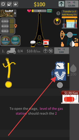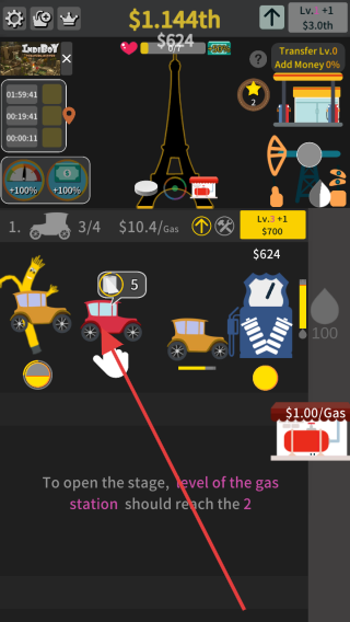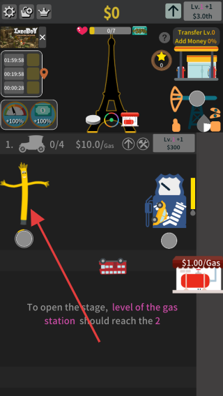 2、积累一定资金后,按箭头所指点击加油站图标,提升加油站等级,朝着目标努力。