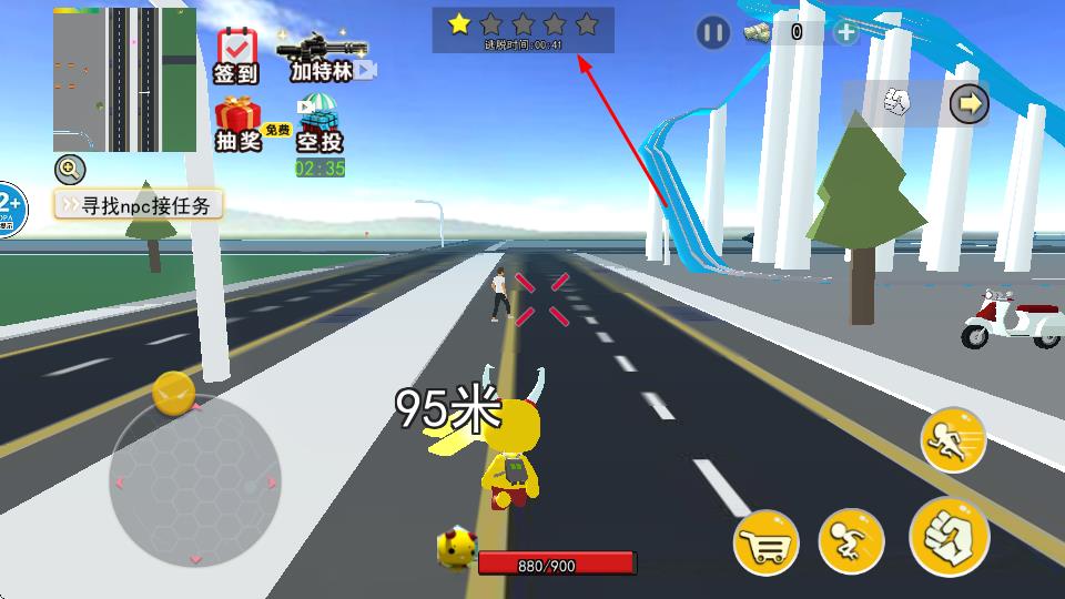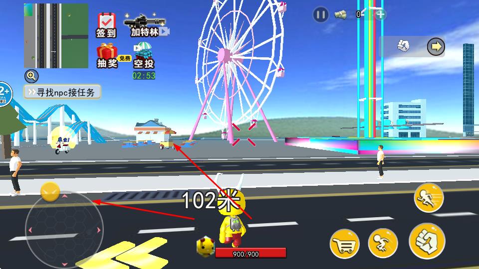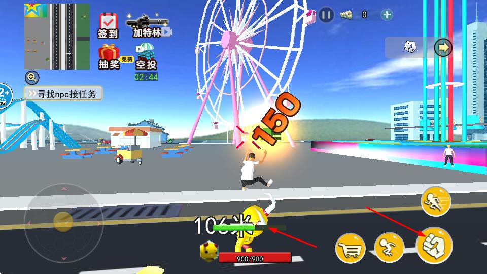 3、游戏设有签到、抽奖、空投等活动,玩家参与可获取资源;同时可通过攻击场景中的人物或物体获取奖励。