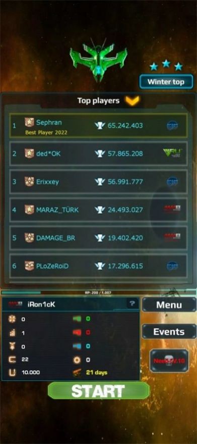 3、图片呈现的是太空射击类界面,含排行榜(展示玩家分数排名)、参与太空对战,在排行榜中角逐名次,体验射击竞技乐趣。