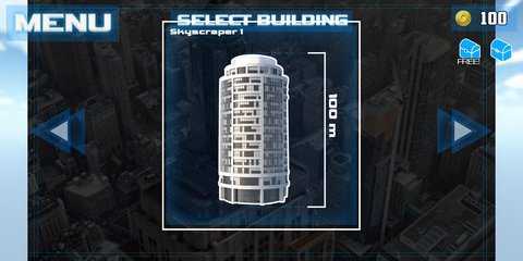 1、在【SELECT BUILDING】界面,使用金币(如100)选择【Skyscraper1】等摩天大楼,为模拟坠落做准备。
