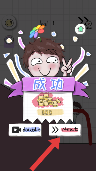 3、界面显示关卡1通关成功,提供【Next】(下一关)按钮,引导玩家继续游戏,成功界面的奖励机制(金币、双倍选项)增强玩家动力。