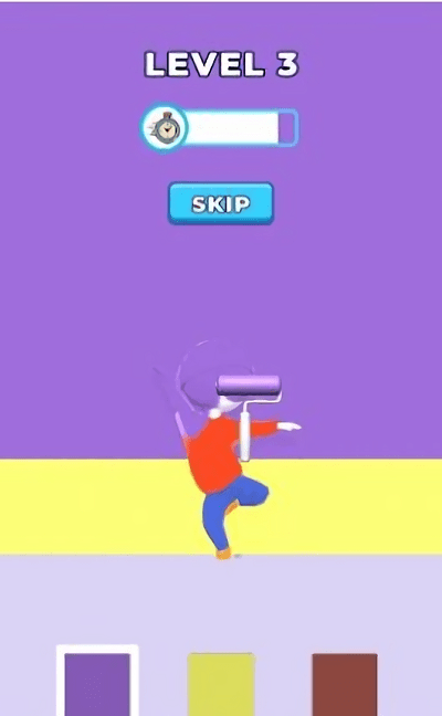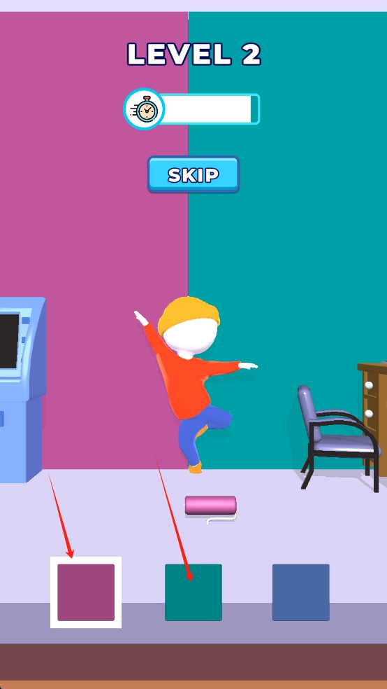 1、开启游戏,玩家操控小偷进入首个关卡场景,挑选合适的油漆,点击周围物体进行喷涂,让自己与环境颜色一致,躲避警察视线。