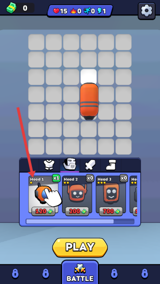 3、花费120金币选取【Head1】头部装备,完善角色装备组合,随后点击“PLAY”开启游戏征程。
