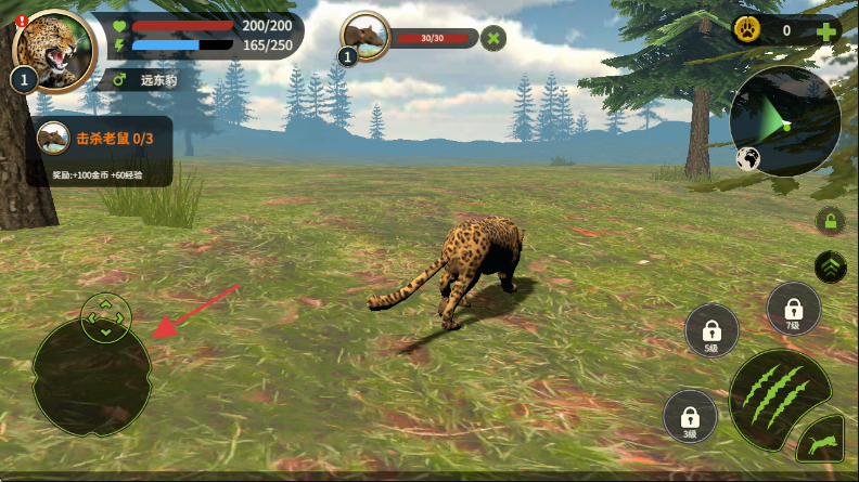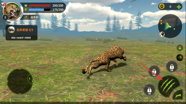 3、当靠近猎物时,点击右侧的爪子形状攻击按钮,发动攻击,完成击杀任务,获取金币和经验奖励。