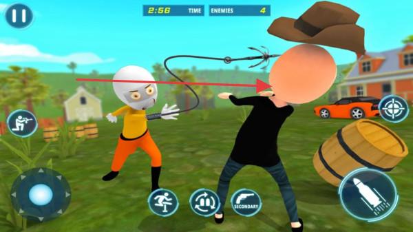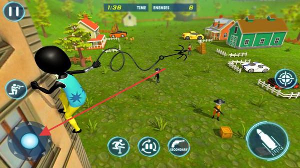 1、进入游戏后,在游戏场景中操控火柴人角色,通过左下角的虚拟摇杆(箭头所指)控制火柴人移动,灵活走位躲避敌人攻击。