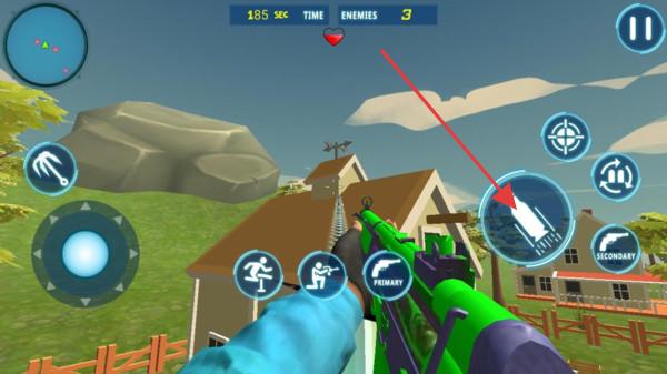 2、屏幕右侧有多个功能按钮,按钮可切换使用特殊武器或技能,点击瞄准镜图案按钮进行精准瞄准,提高命中率。