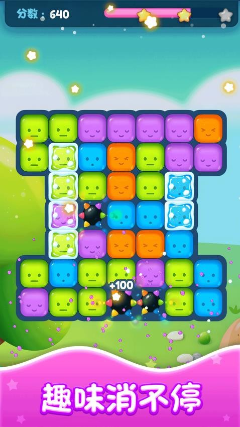 1、创新点消机制突破传统三消规则,采用相邻同色方块连锁消除设计,搭配随机刷新的特效炸弹,每局都能体验策略与运气的巧妙碰撞。