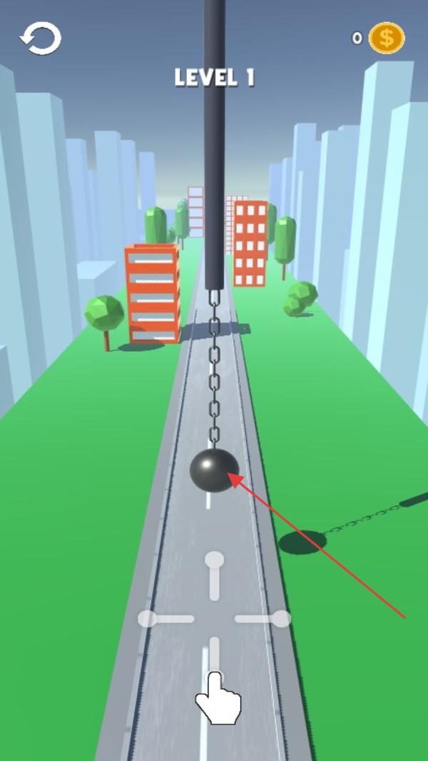 2、在游戏行进过程中,利用铁球摆动撞击道路两旁的物体,将其破坏,成功破坏物体可获得金币奖励。