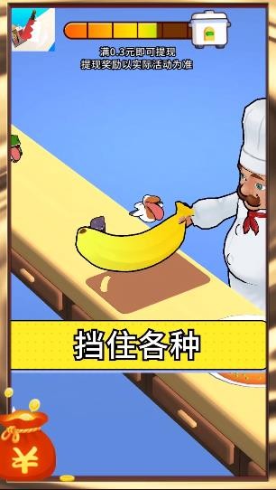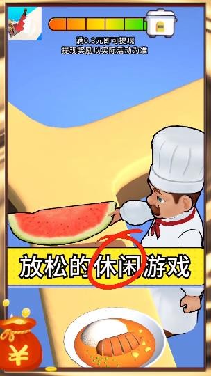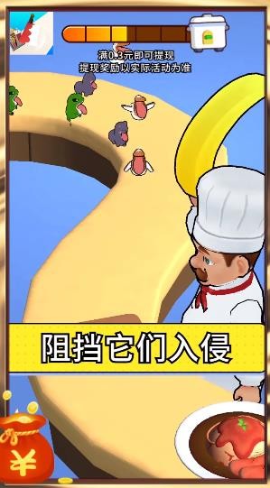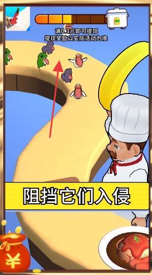 1、进入游戏后,玩家操控厨师角色,利用食材进行防御,屏幕上方有进度条,显示收益积累情况,满0.3元可提现。
