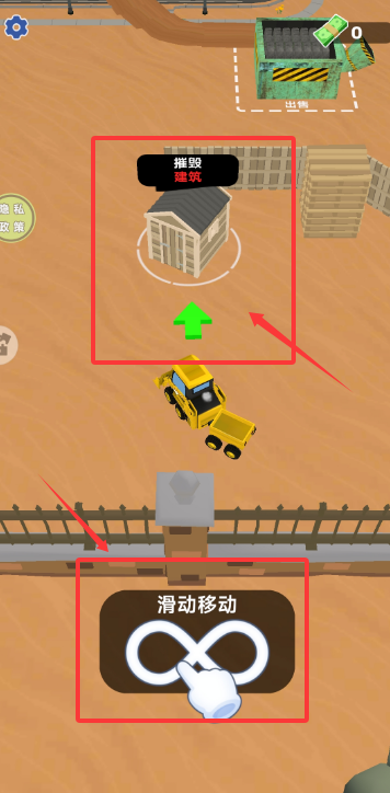 1、进入工地场景后,通过手势操控工程车移动,完成指定区域的拆除作业。