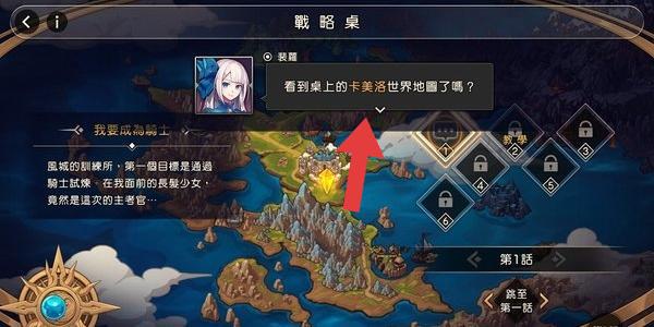 2、进入战略桌界面,根据提示查看卡洛洛世界地图,按照指引进行第一站的冒险任务,推进游戏剧情。