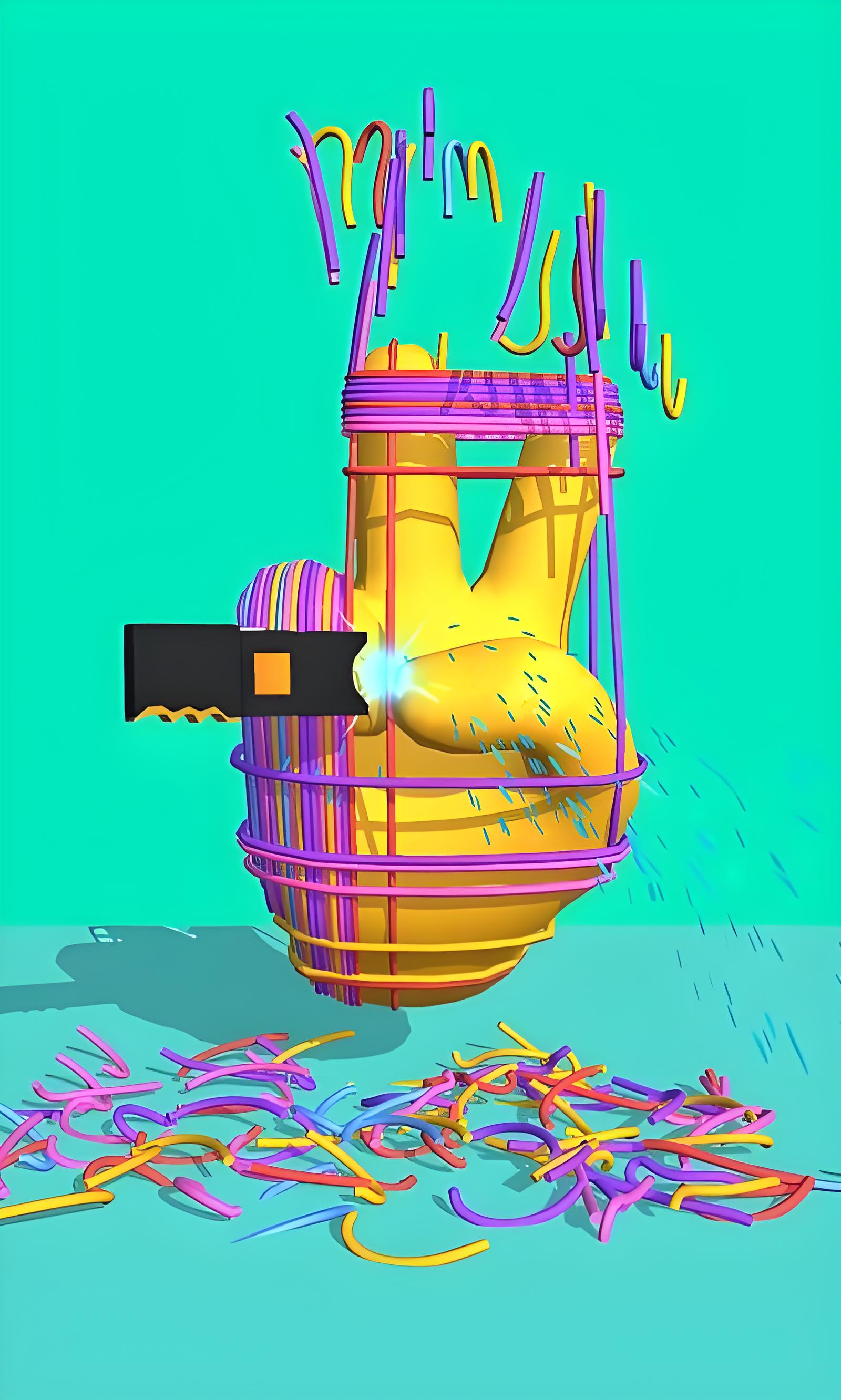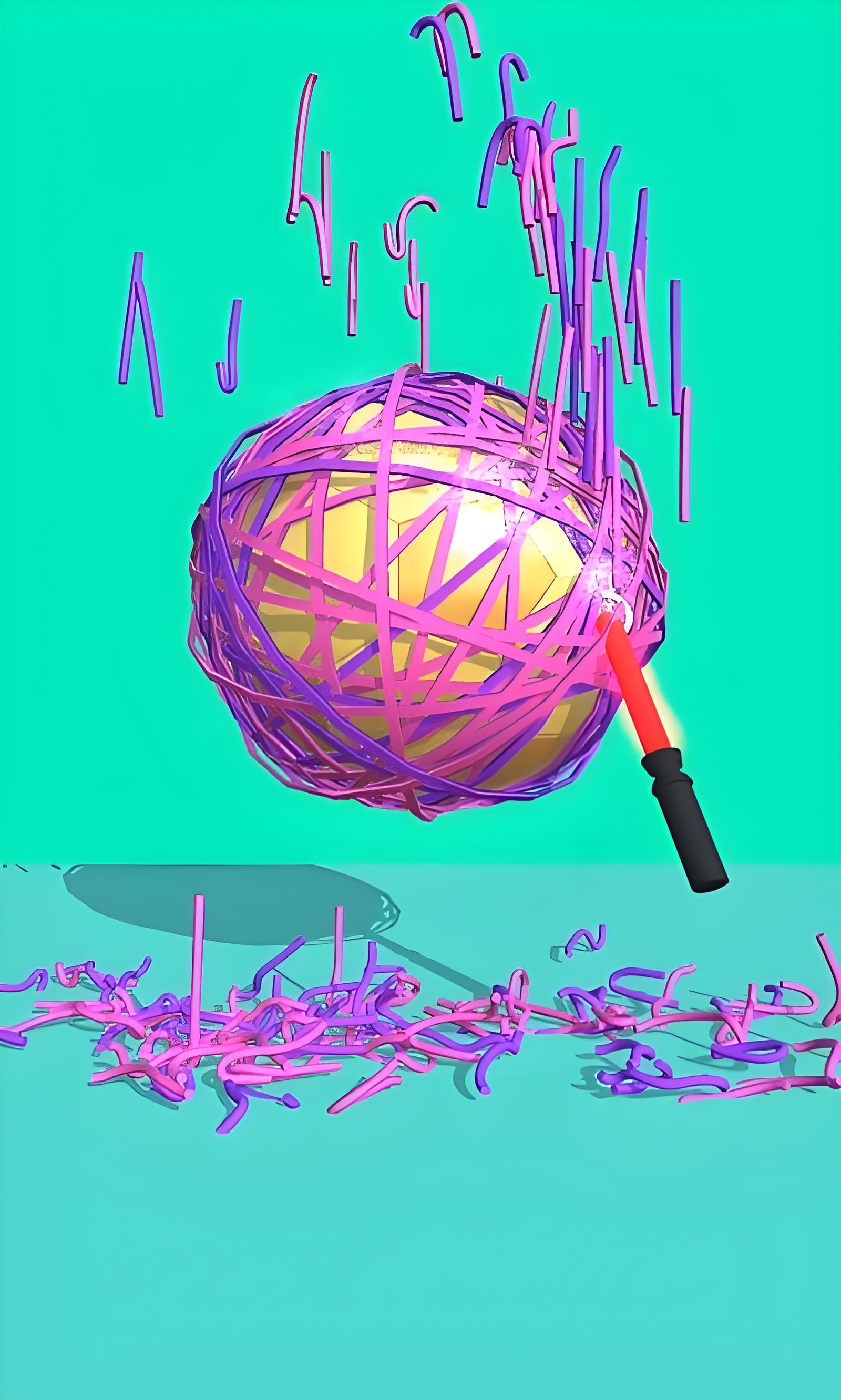 2、随着关卡推进,橡皮筋运动轨迹变得复杂,同时出现各种辅助或干扰道具,需灵活运用道具完成切割任务,突破重重关卡。