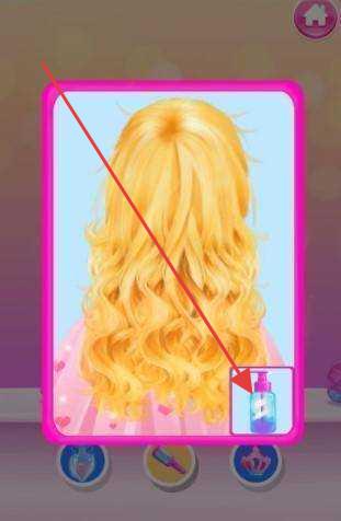 2、依照箭头所指,选择护理道具(如点击右下角的护理液图标),对角色头发进行护理操作,改善头发状态。