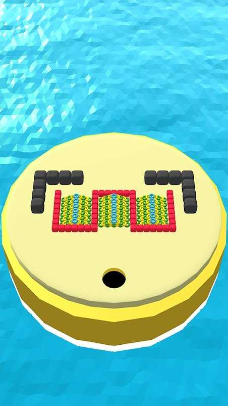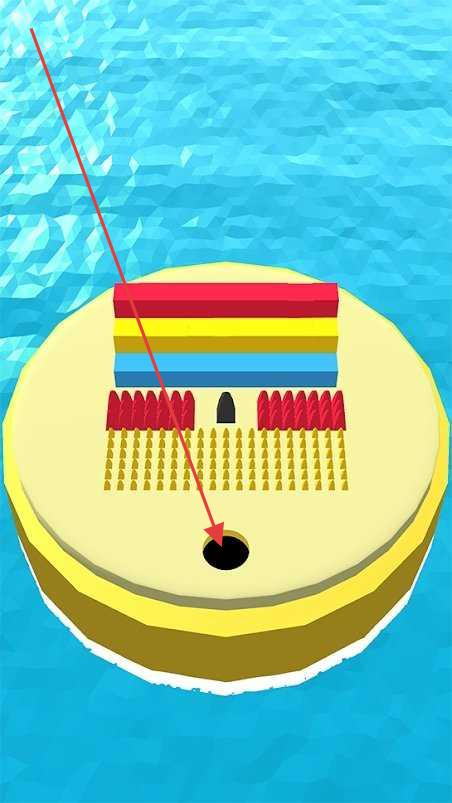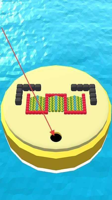 1、游戏中面对圆形平台关卡,按箭头指示观察布局,操控黑洞吸收平台上的物体(如彩色方块),注意避开黑色障碍块。