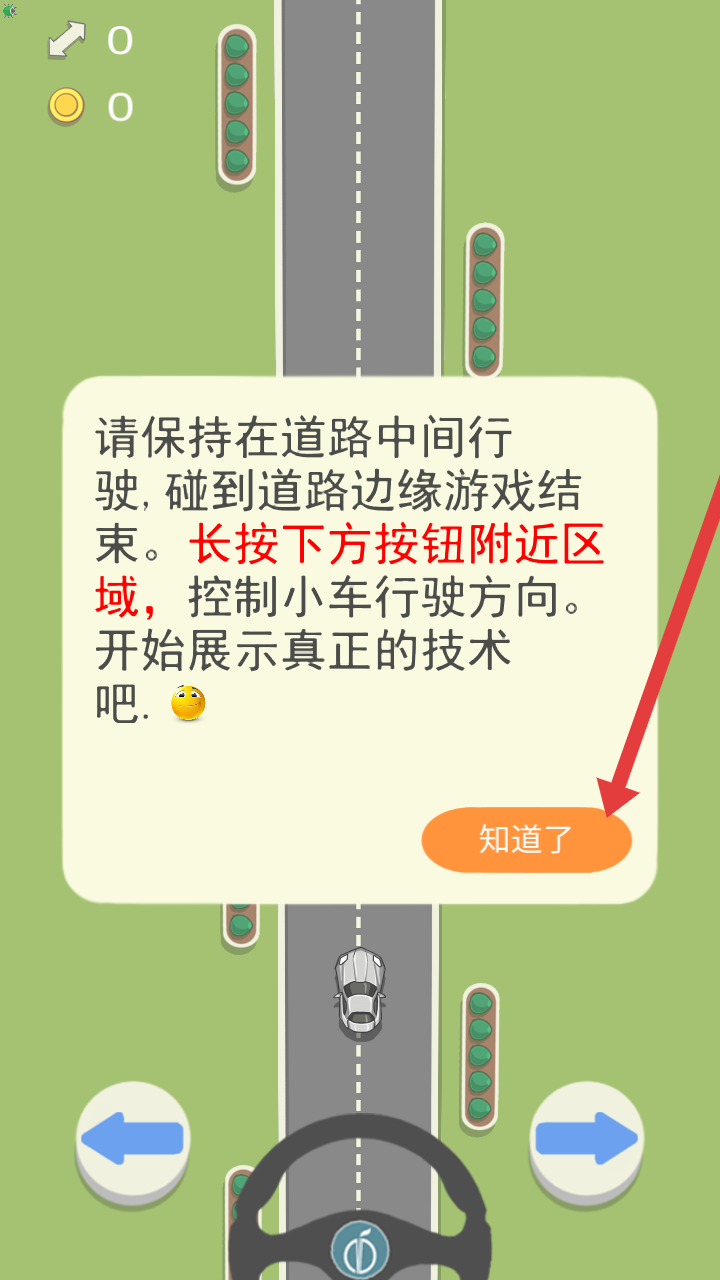 2、阅读游戏提示,点击【知道了】,了解操控规则,长按按钮附近区域控制小车方向,保持在道路中间行驶。