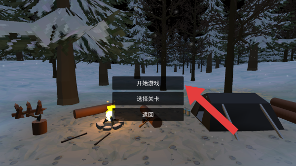 1、场景为雪地森林(含篝火、帐篷等野外元素),点击【开始游戏】按钮,营造沉浸式野外探索氛围,属此类游戏的典型启动界面布局。