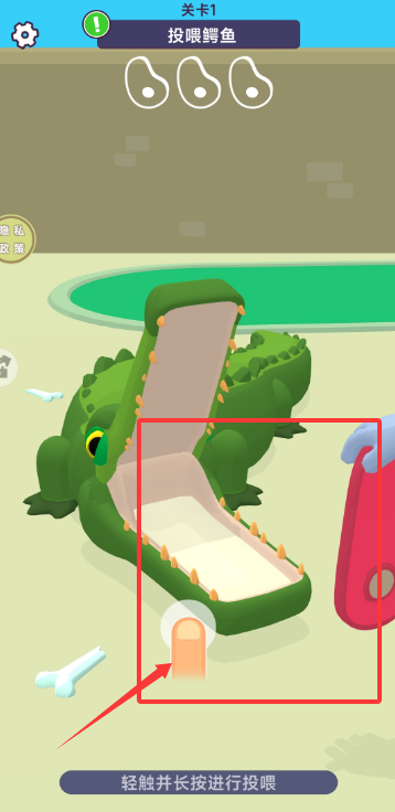 1、点击饲料拖动至鳄鱼嘴边,根据成长阶段选择合适的食物进行投喂。