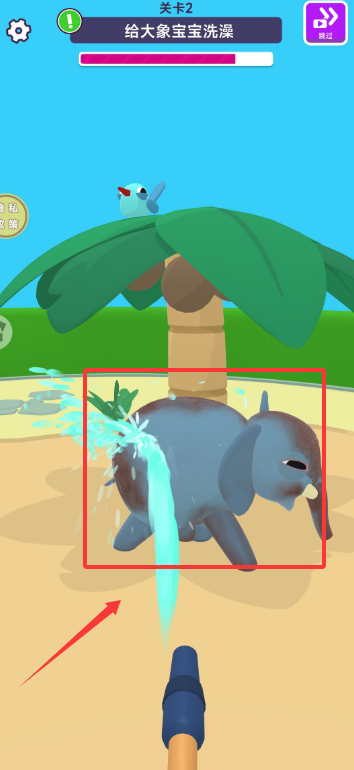 2、使用沐浴工具为大象宝宝清洁身体,注意调节水温避免惊吓到小动物。