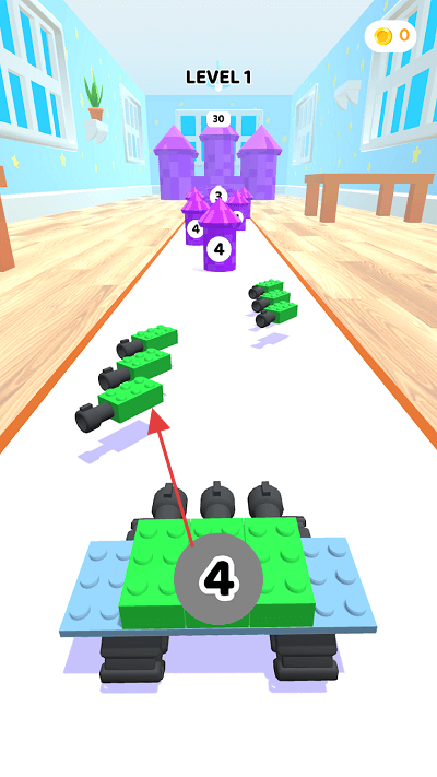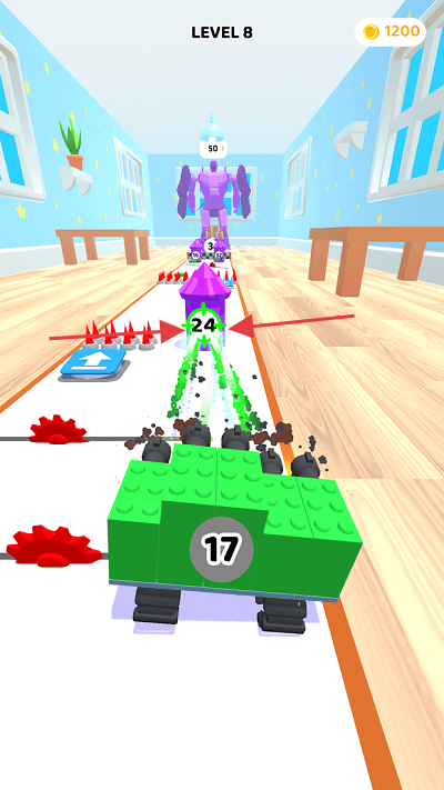 2、玩家在前进过程中收集绿色积木部件,提升战车等级,增强战车的攻击和防御能力。