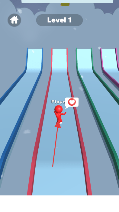 3、玩家操控红色小人在多个颜色不同的赛道中选择正确路径前进,避开危险区域,顺利通过关卡。