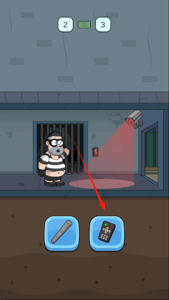 2、进入第2关,面对监控摄像头,选择遥控器图标,尝试用其干扰摄像头。