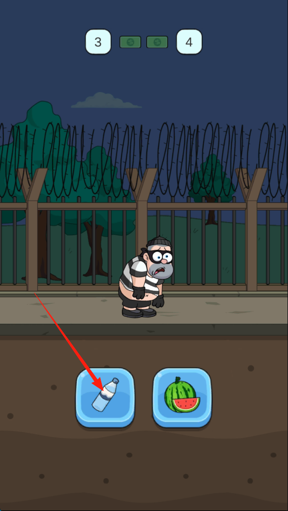 3、来到第3关,看到人物身处有铁丝网围栏的场景,点击水瓶图标,应对当前状况。