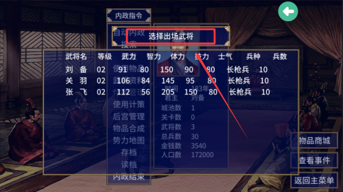 4、资源利用最大化,搜索到的物品及战利品合理分配给武将,提升其能力与忠诚度,增强整体战力。