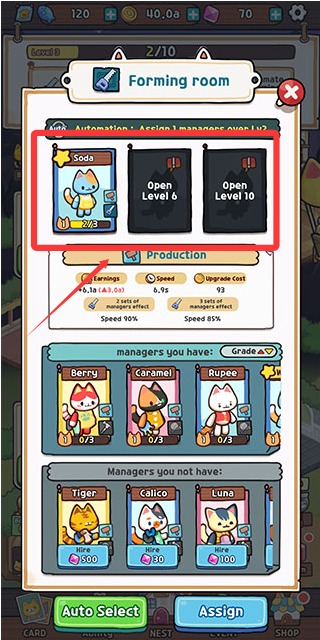 3、之后点击图标为指定区域添加适合的经理小猫即可全自动生产了。