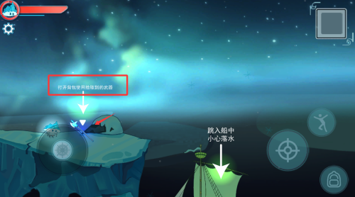 3、按照游戏提示,打开背包捡起的武器,跳进船中。