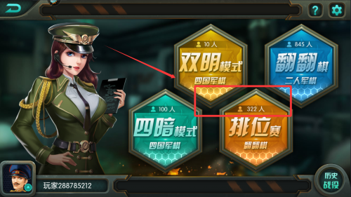 1、进入游戏后玩家可选择多种玩法,如经典的四国军棋,四人分占棋盘四角,两两联盟对抗。