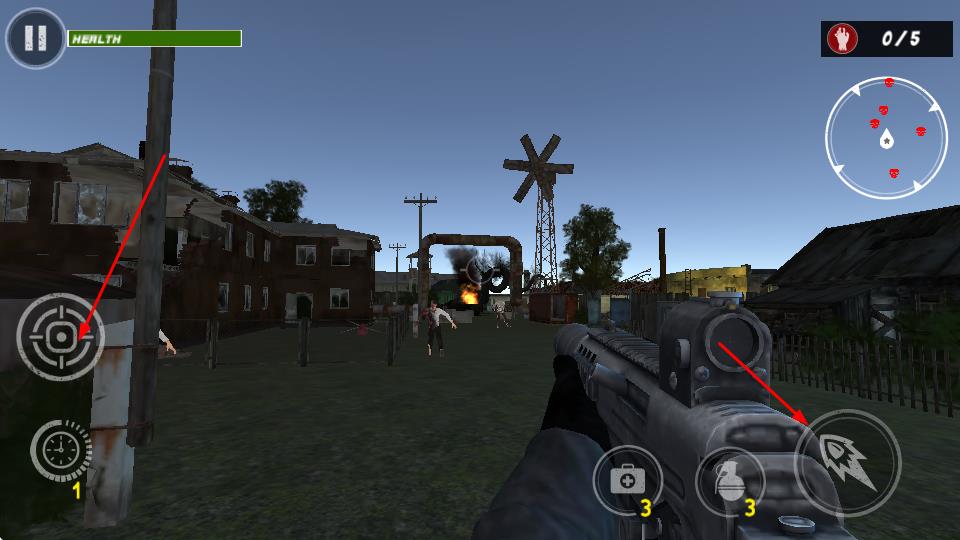 1、射击战斗:在布满僵尸的场景中,通过滑动瞄准、点击射击操作,利用掩体躲避攻击,精准打击僵尸弱点,突出重围。