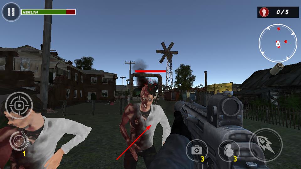 2、战斗途中,不断有僵尸从各个角落扑来,滑动屏幕瞄准,点击射击键精准击杀,同时留意弹药数量与周围威胁。