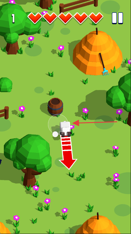 2、操控小羊沿红色箭头方向移动,在农场场景中探索,避开障碍或收集物品推进关卡。