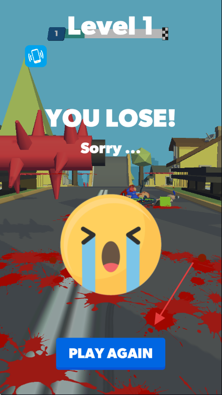 3、若碰撞失败,点击【PLAY AGAIN】重新开始第一关,继续挑战躲避障碍。