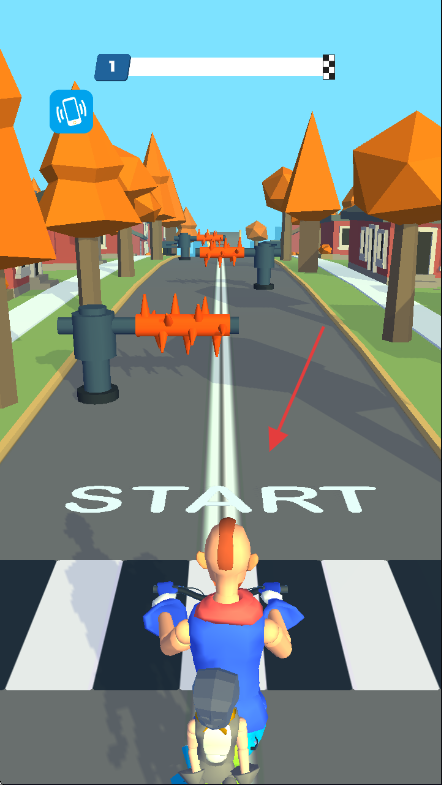 1、站在【START】线后,准备操控角色出发,开始在道路上骑行,躲避前方橙色带刺障碍物。