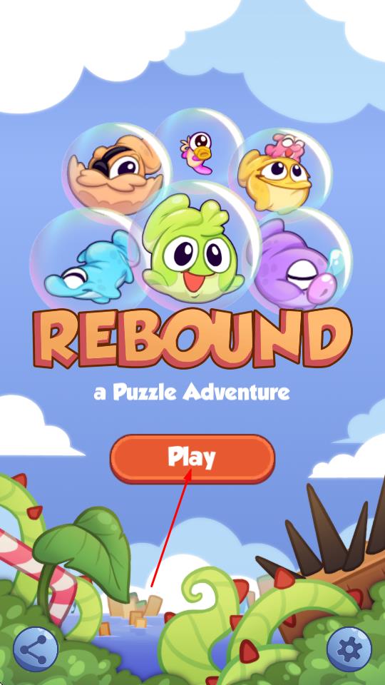 1、进入反弹解谜冒险界面,在关卡选择页点击“PLAY”,小球出现在起点平台,滑动屏幕调整发射角度准备出发。