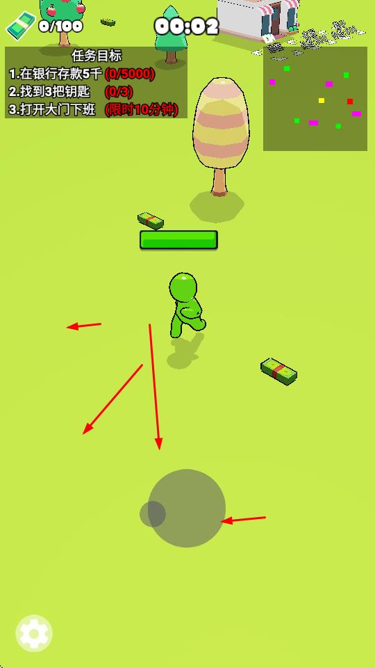1、游戏设定限时任务,玩家操控绿色小人完成多项任务目标,如在银行存款5千、找到3把钥匙、打开大门下班等。