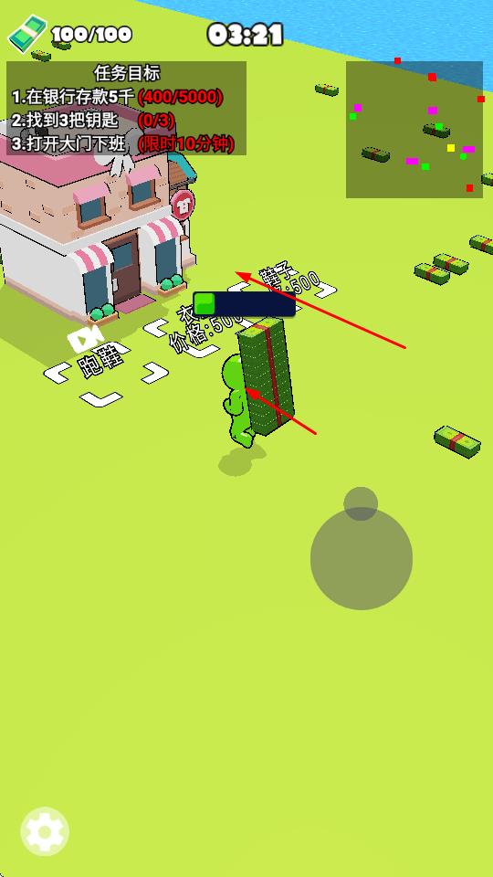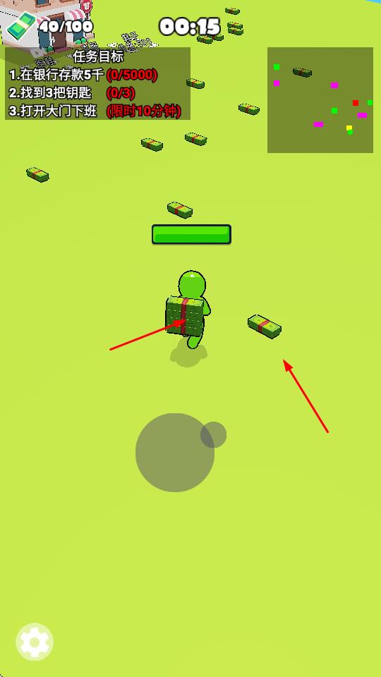 2、玩家在绿色场景中收集绿色钞票等资源,积累资金以完成存款任务,同时探索场景寻找钥匙。
