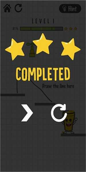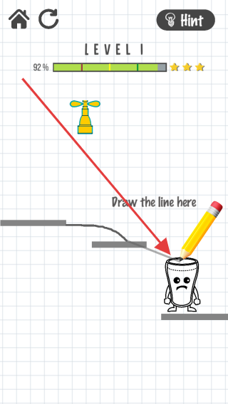 3、在【LEVEL 1】关卡中,按箭头指引用铅笔在指定位置(如杯子上方)绘制线条,引导液体流入杯子,达到目标进度(如92%)。