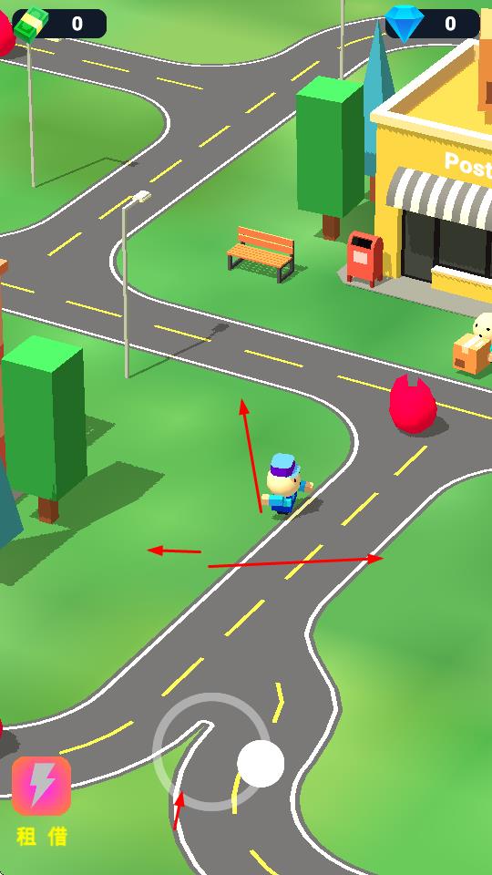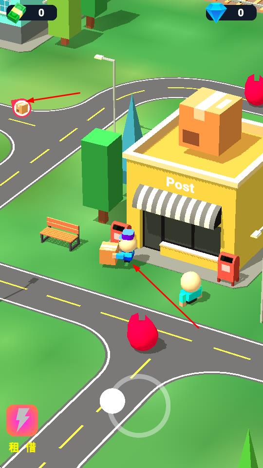 1、玩家操控快递员角色在道路场景中移动,前往邮局等地点取货,并将货物送到指定位置。
