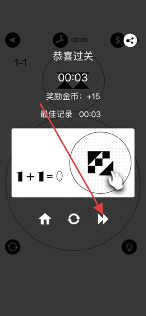 3、成功通关后,会显示通关信息、奖励及最佳记录等,此时可点击箭头所指按钮,进入下一关继续游戏,不断挑战新关卡。