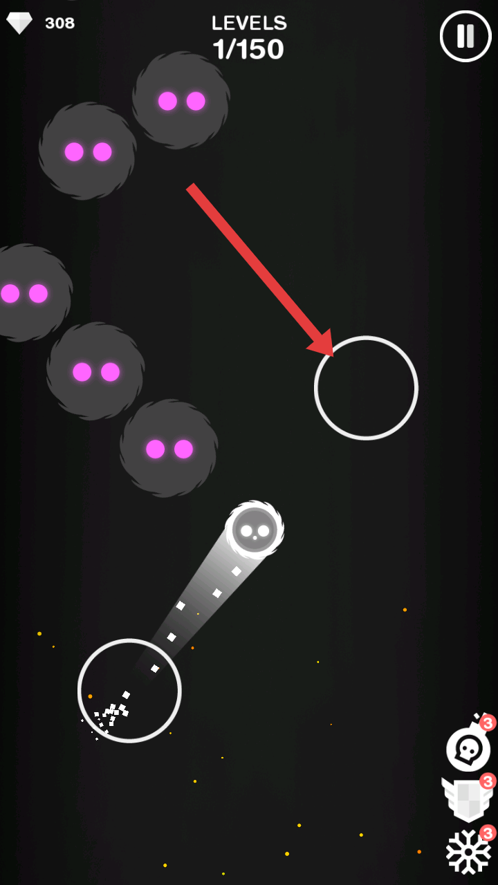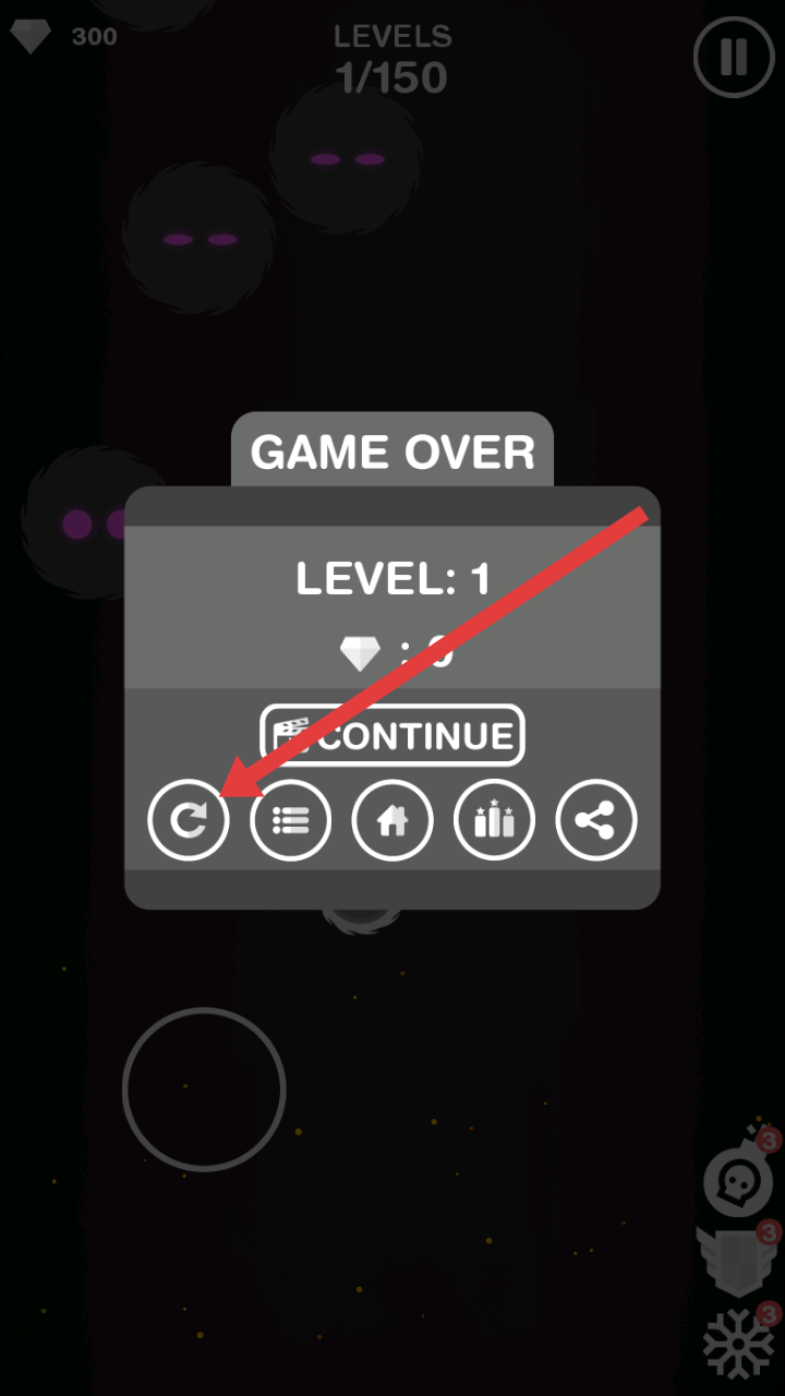 2、在碰到其他的小黑球游戏失败后,点击重新开始按钮(箭头指向的循环图标),重新挑战当前关卡。